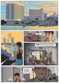 Le plaisir visuel de la lecture ne réside pas que dans la découverte de lieux exotiques. Le lecteur retrouve la clarté de la narration visuelle de l'auteur au travers de 6 planches muette d'une lisibilité impeccable, avec un tension dramatique étonnante, que ce soit Caroline Baldwin en train de sortir en courant de la prison désaffectée, Ed Mitchum déambulant dans Vientiane, ou la superbe progression en radeau de bambou sur le fleuve. Taymans continue d'être un excellent metteur en scène et un directeur d'acteurs naturaliste qui sait rendre visible l'état d'esprit des personnages Le lecteur peut ressentir tout le mépris teinté de colère de Caroline Baldwin à l'encontre de Arnold Levis lors du dîner en terrasse, la tension dans les livreurs de la rançon pressés et soulagés de la remettre à Baldwin, la concentration dans les pratiquants des arts martiaux, la concentration de Baldwin dans sa réflexion pour comprendre la référence à la lagune et la photographie envoyée par courriel. La mise en couleurs conserve, elle aussi, une approche naturaliste, avec une petite faute de goût pour la séquence où Caroline Baldwin prend son bain, où l'artiste a exagéré la brillance de la peau par des nuances trop claires, aboutissant à une apparence de plastique plus que de peau satinée. Il sourit aussi en voyant la page 1 du tome précédent (Caroline sur son lit avec le sac de billets de banque) reprise dans ce tome, avec un autre texte, attestant de l'anticipation de l'auteur.