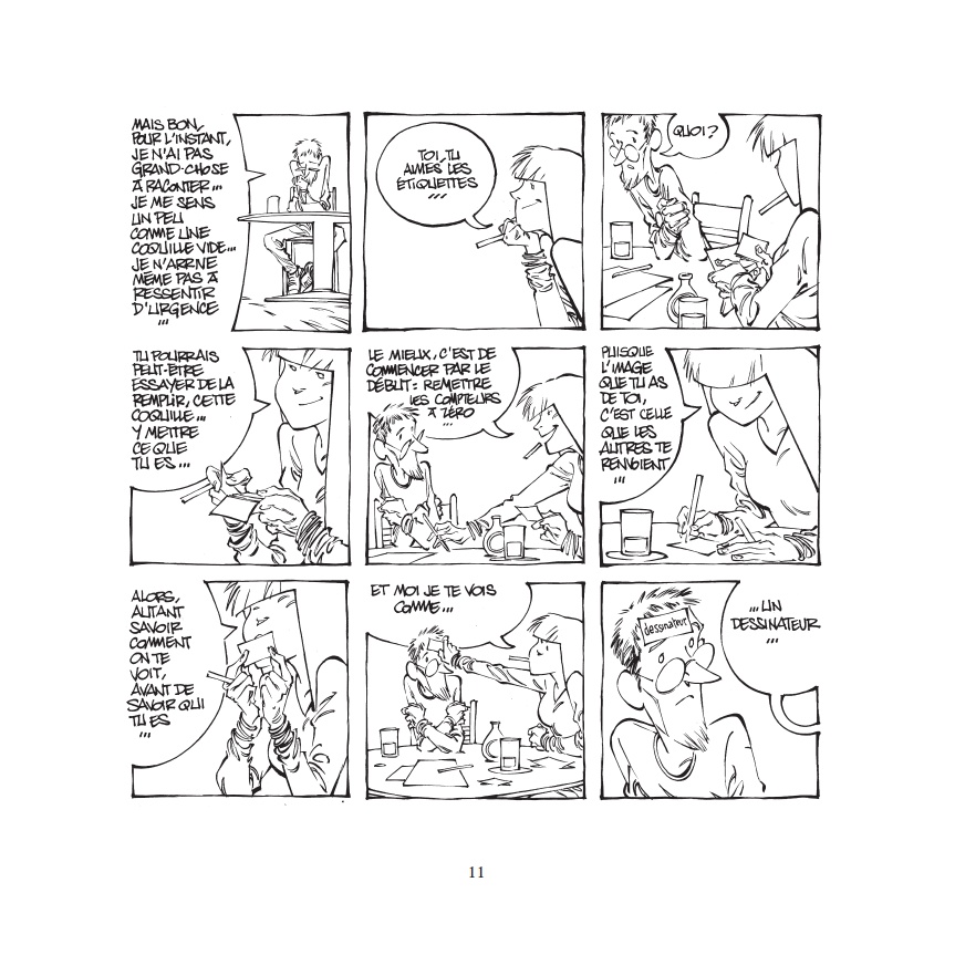 Au jardin, trois pages. Frédéric est assis en tailleur dans son jardin, tranquillement en train de s’en griller une. Son chat passe à côté de lui, il lui caresse le dos. Il se dit qu’il va falloir qu’il s’occupe du jardin. Par quoi commencer ? À peine, seul, et il est déjà la proie de questions existentielles. Il s’allonge sur le dos, et il continue à fumer tranquillement. Facebook, trois pages. Frédéric est à sa table de dessin : son téléphone sonne. Il décroche et la discussion commence.il explique à son interlocuteur qu’il est en train de travailler. Il l’informe que son épouse est partie, que les enfants sont restés avec lui. Frédéric ne sait plus trop où il en est : c’est une expérience éprouvante, il a l’impression d’être en mille morceaux. Il raccroche car sa grande fille vient de rentrer. Elle s’enquiert de son état : il ne sait plus trop ce qu’il est maintenant. Elle lui répond que c’est comme un profil facebook : il a le choix entre Marié, Célibataire, ou C’est compliqué. Le dessinateur, 4 pages. Frédéric est installé à une terrasse de café, en train de dessiner et de fumer une cigarette. Il en tire une bouffée et la jette négligemment, sans faire attention. Il se rend compte que le mégot a atterri dans le verre de la jeune femme assise à la table d’à côté. Elle le regarde, lui sourit et lui demande s’il a du feu. Elle rallume la cigarette trempée et entame la conversation. Il lui confirme qu’il fait de la bande dessinée, mais pour l’instant il n’a pas grand-chose à raconter. Il se sent un peu comme une coquille vide, il n’arrive pas à ressentir d’urgence. Elle décrète qu’il aime les étiquettes.